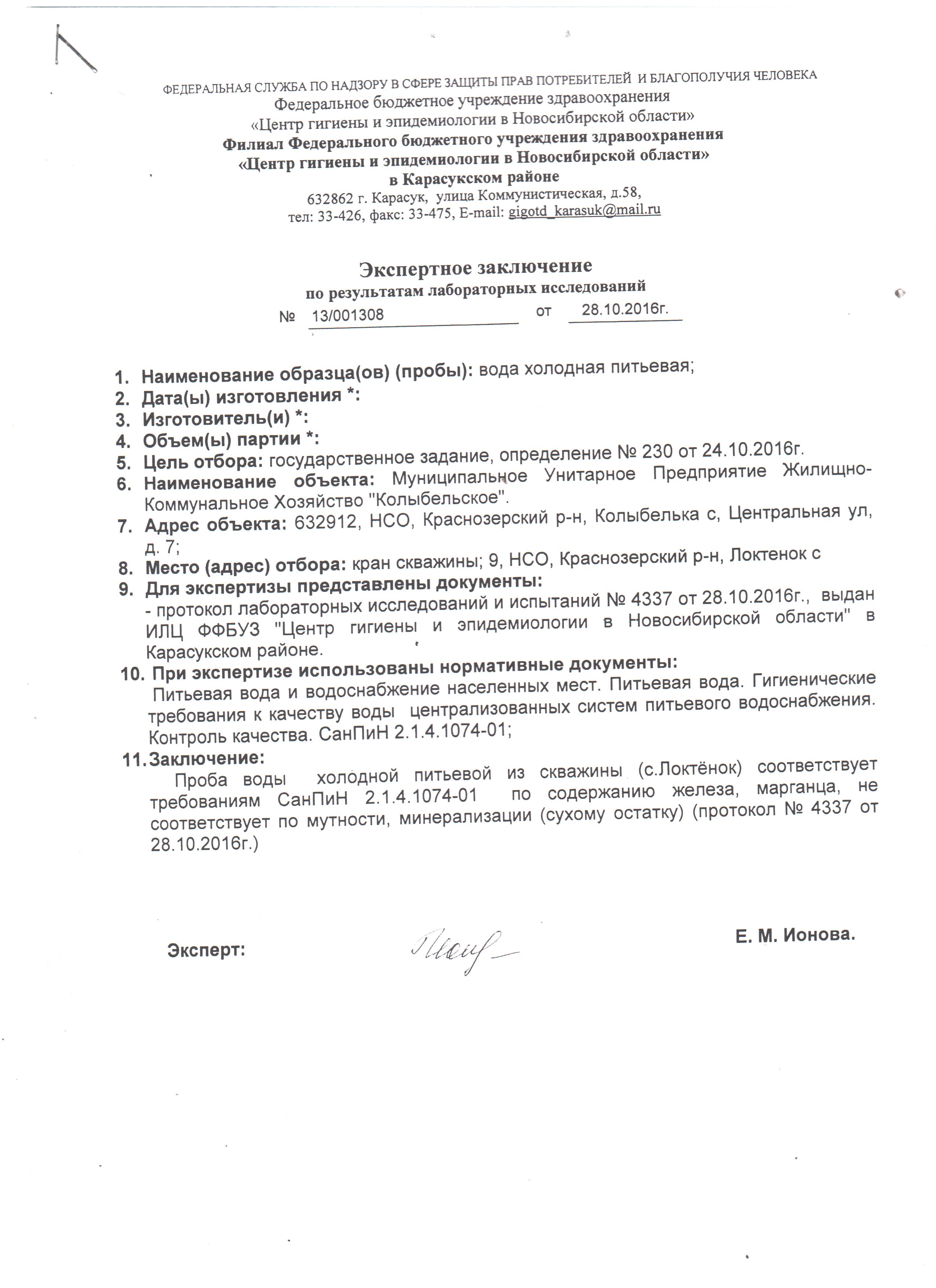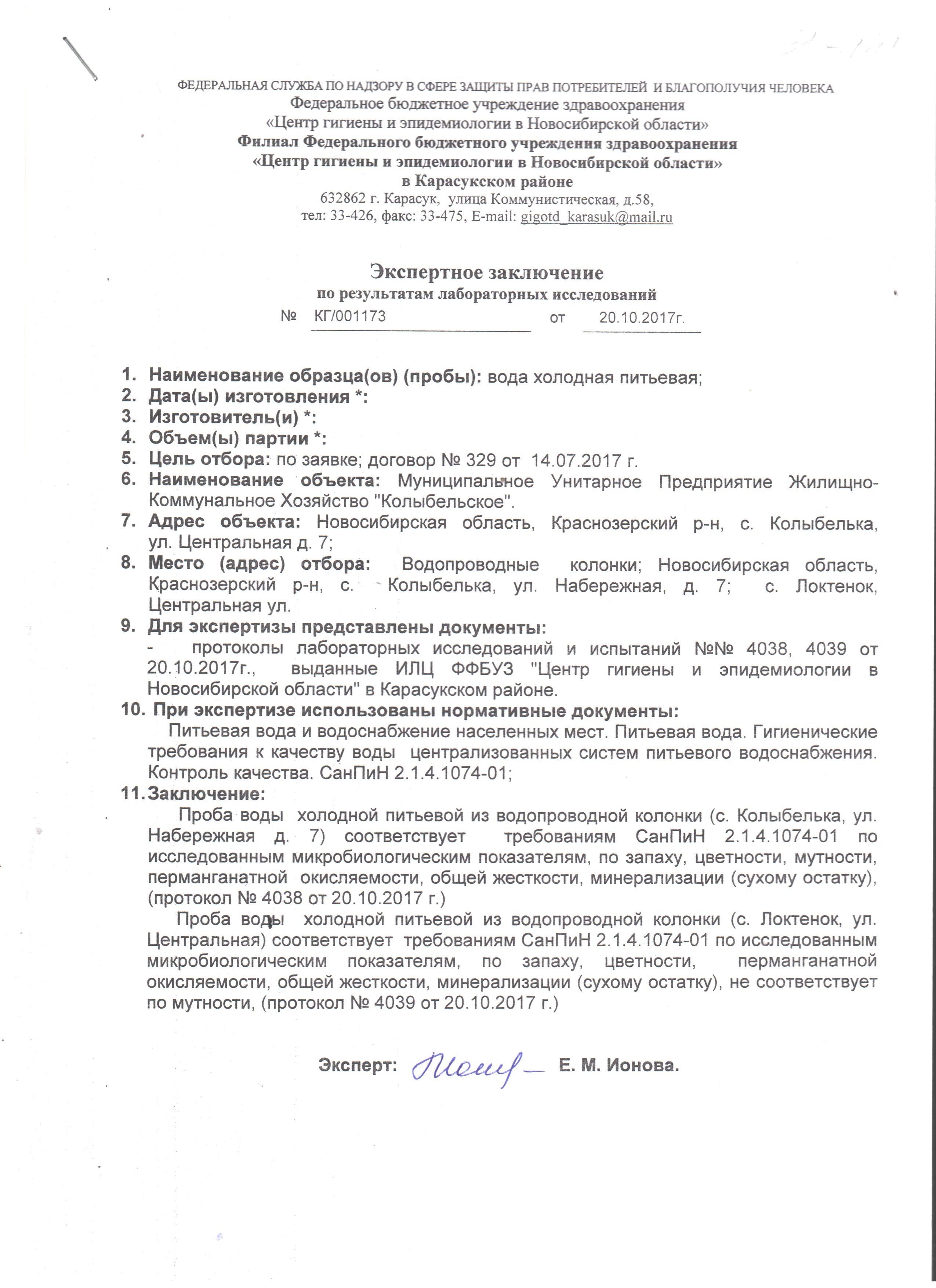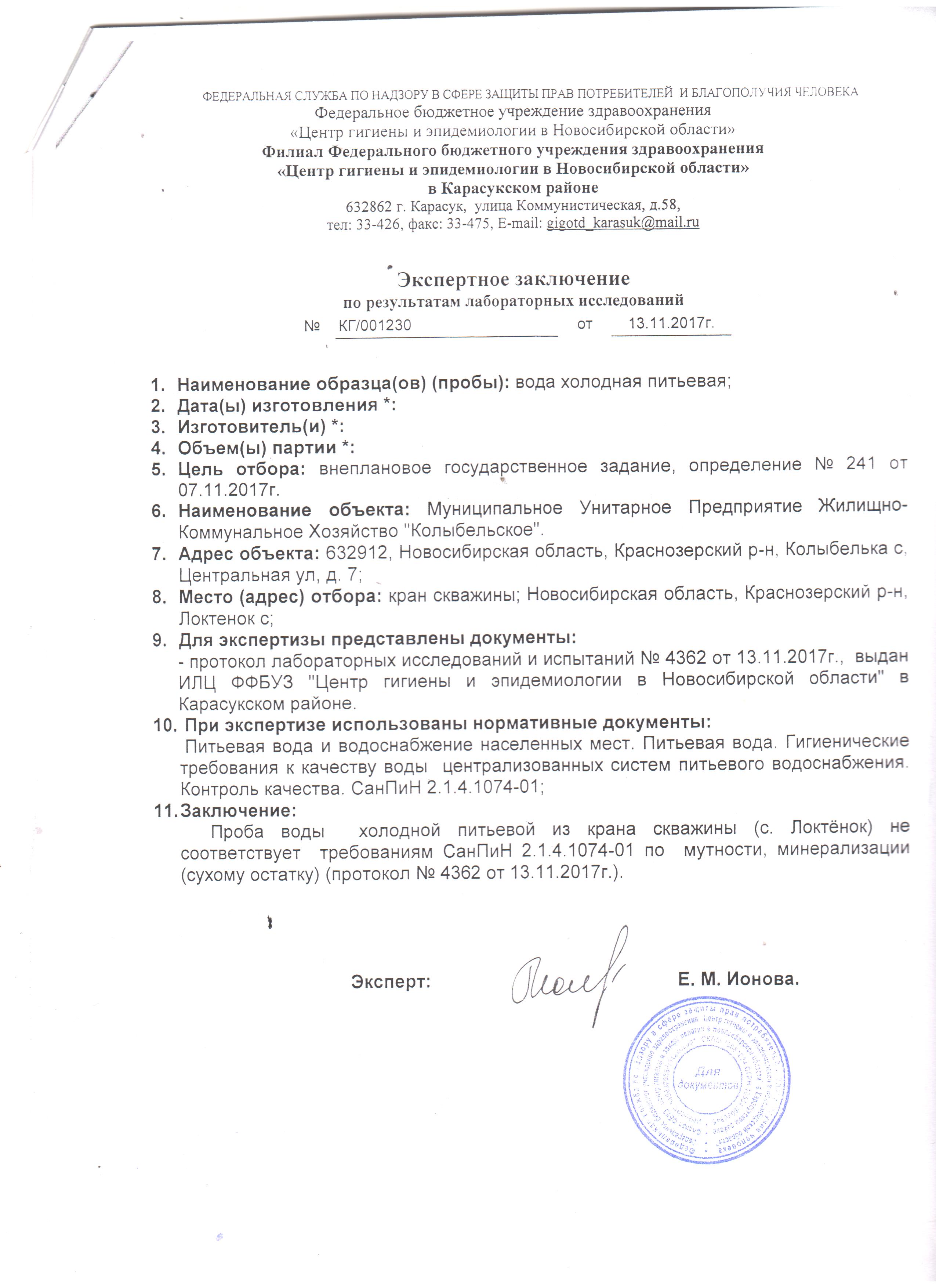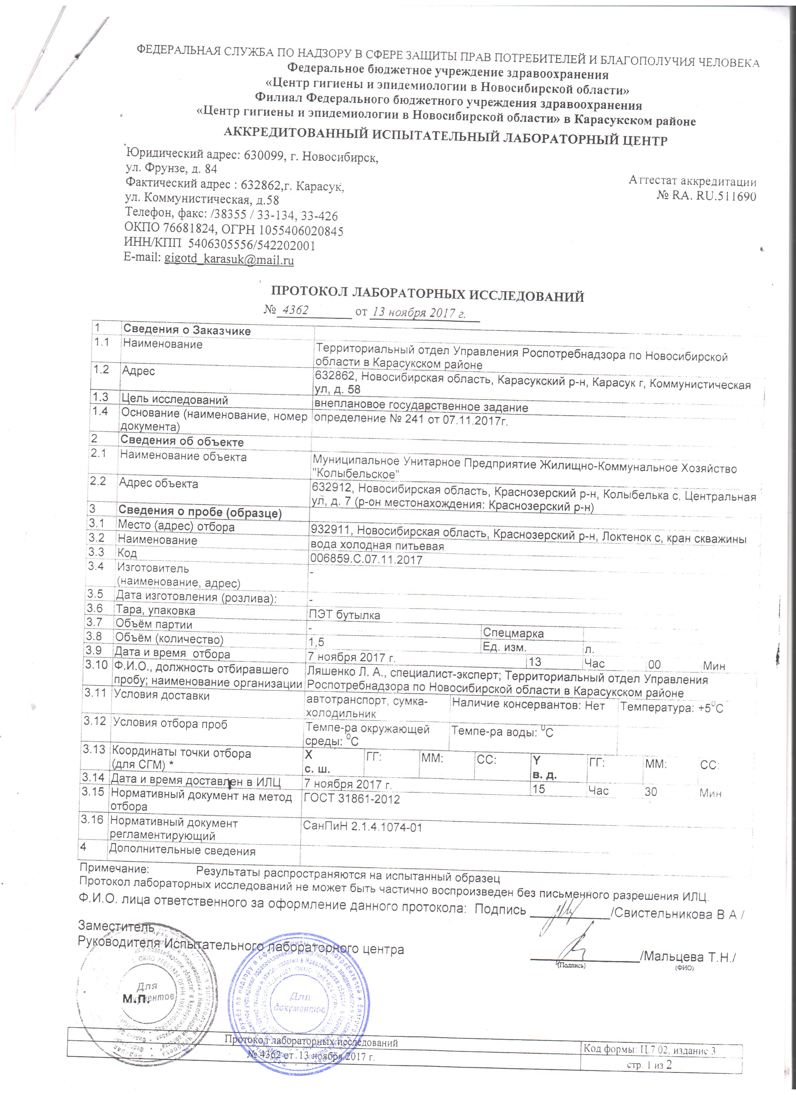 Управление Роспотребнадзора по Новосибирской области направила нам информацию о результатах проверок проведенных в ноябре 2018года в отношении организации осуществляющих водоснабжение на территории Колыбельского МО