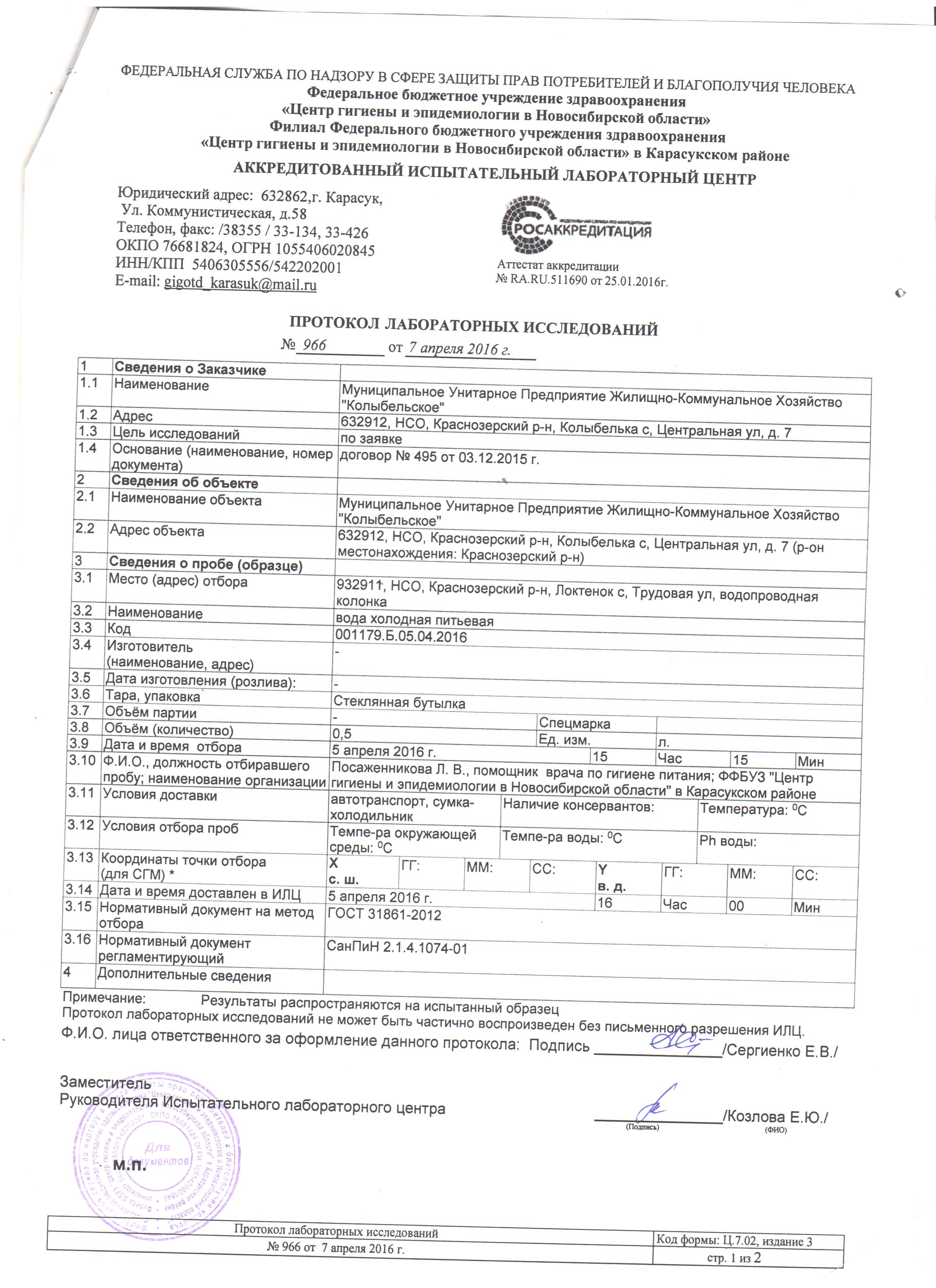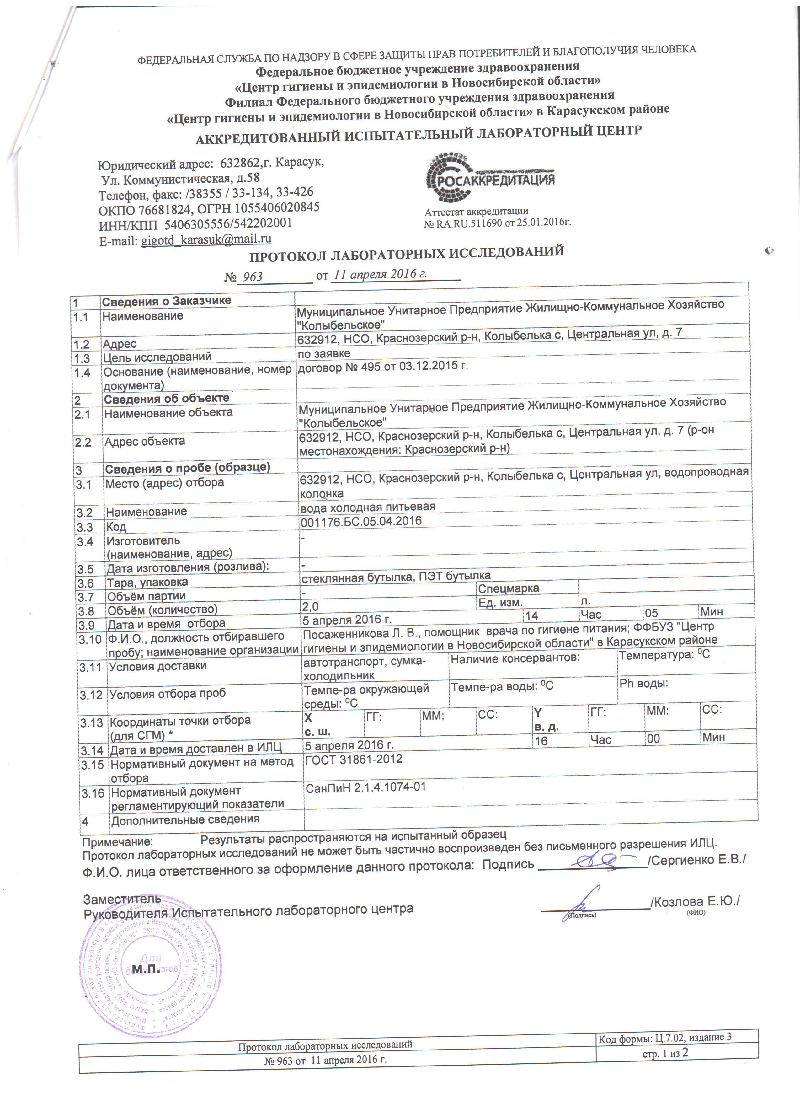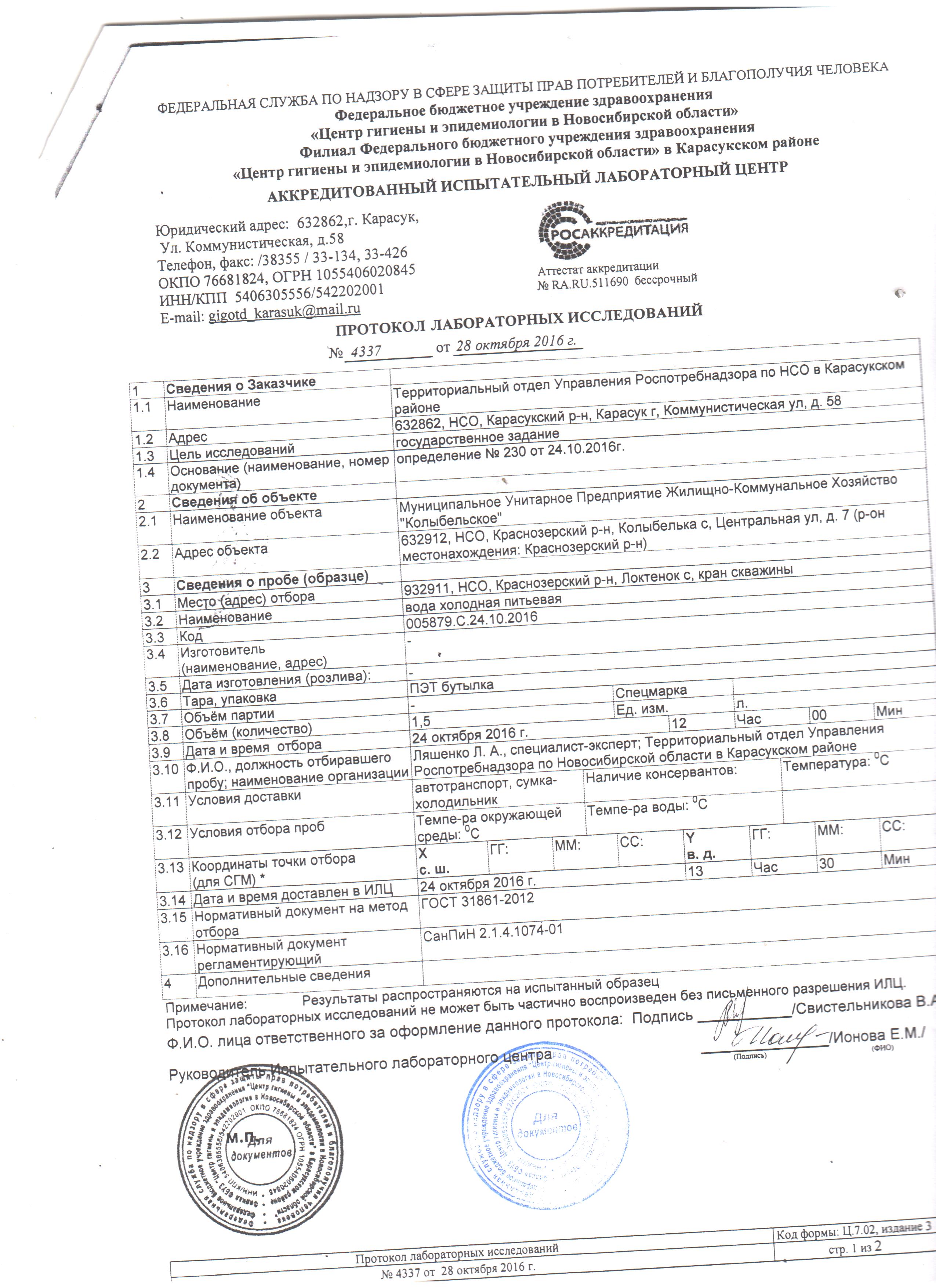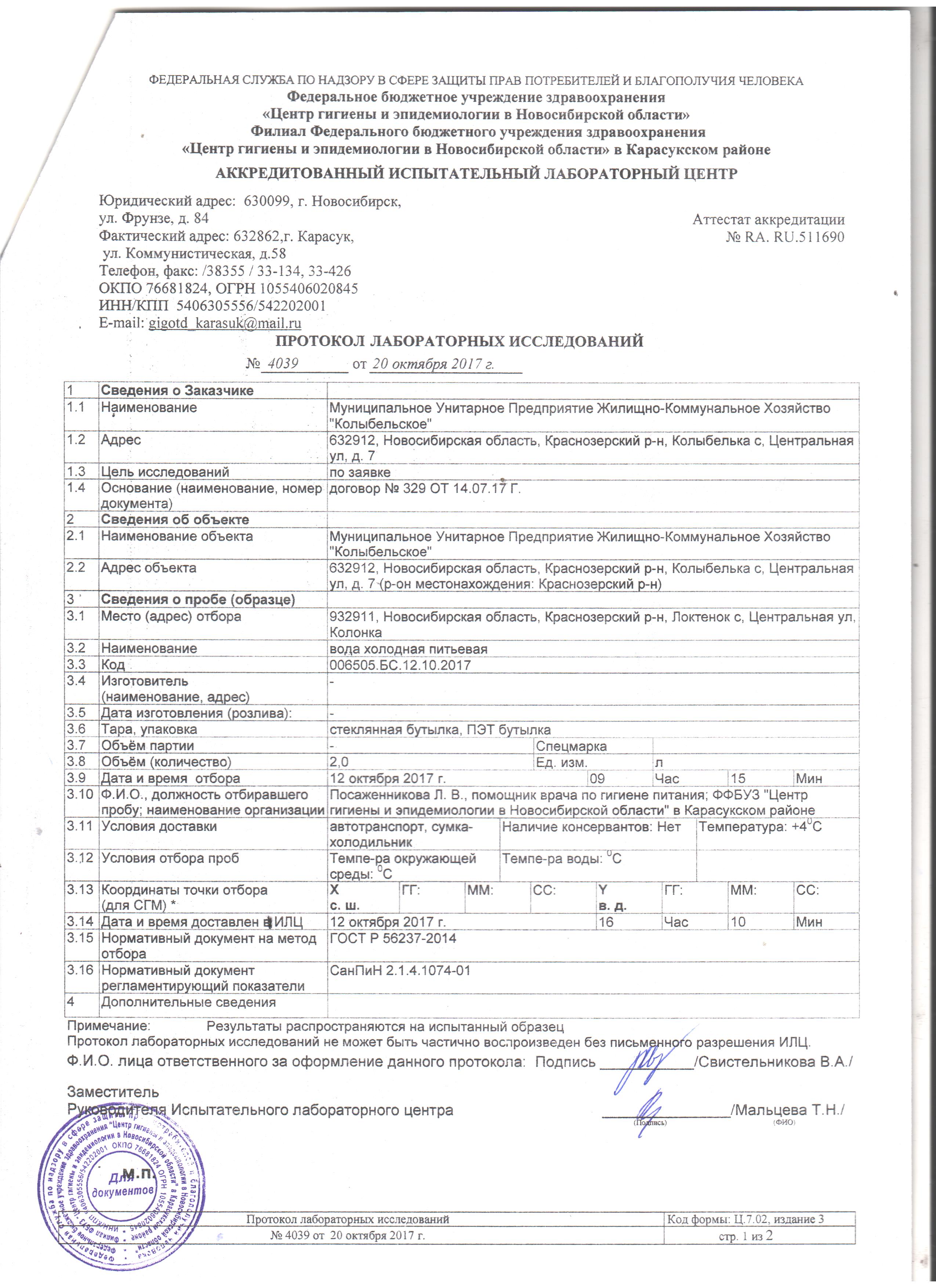 Управление Роспотребнадзора по Новосибирской области направила нам информацию о результатах проверок проведенных в ноябре 2018года в отношении организации осуществляющих водоснабжение на территории Колыбельского МО