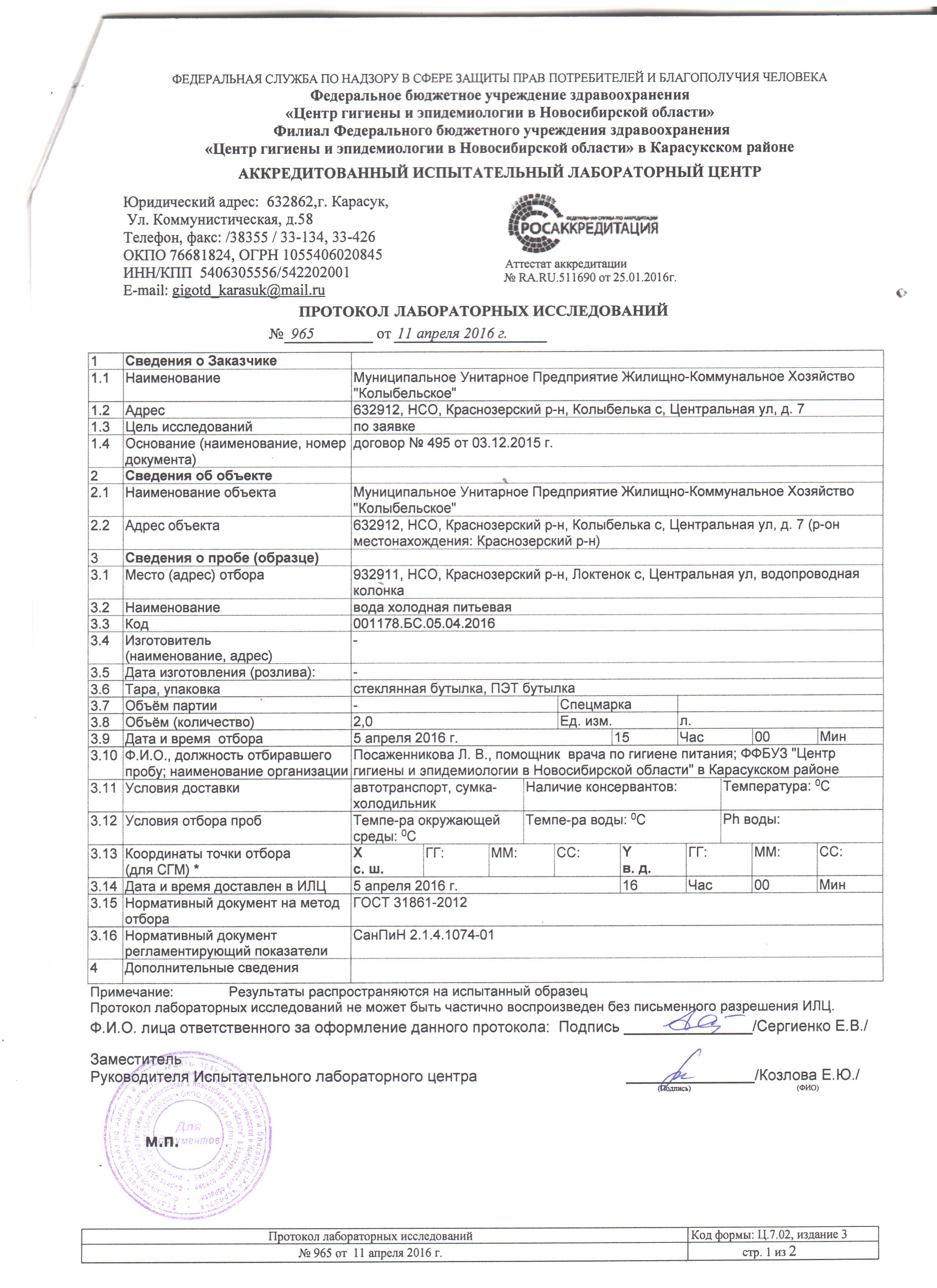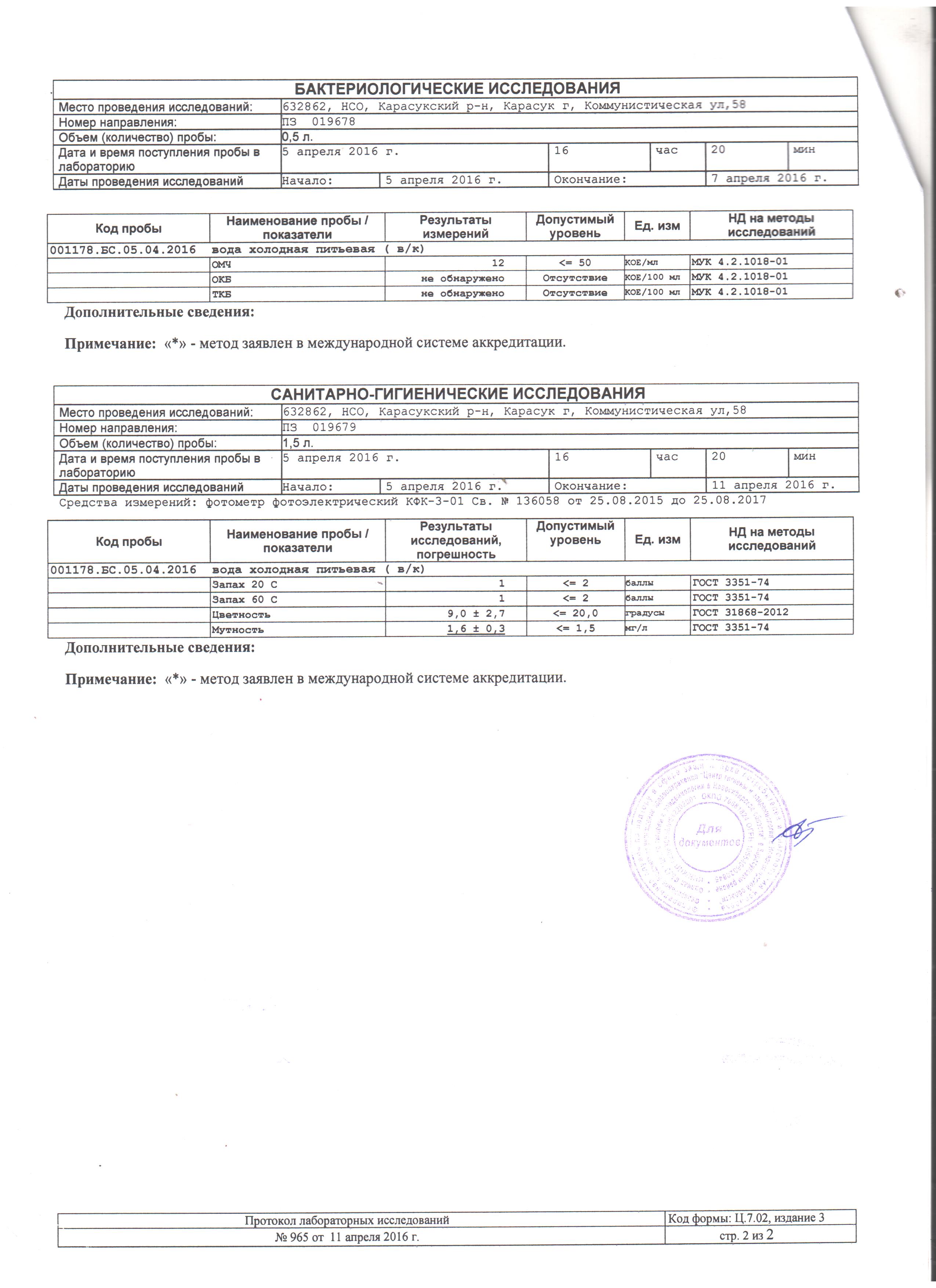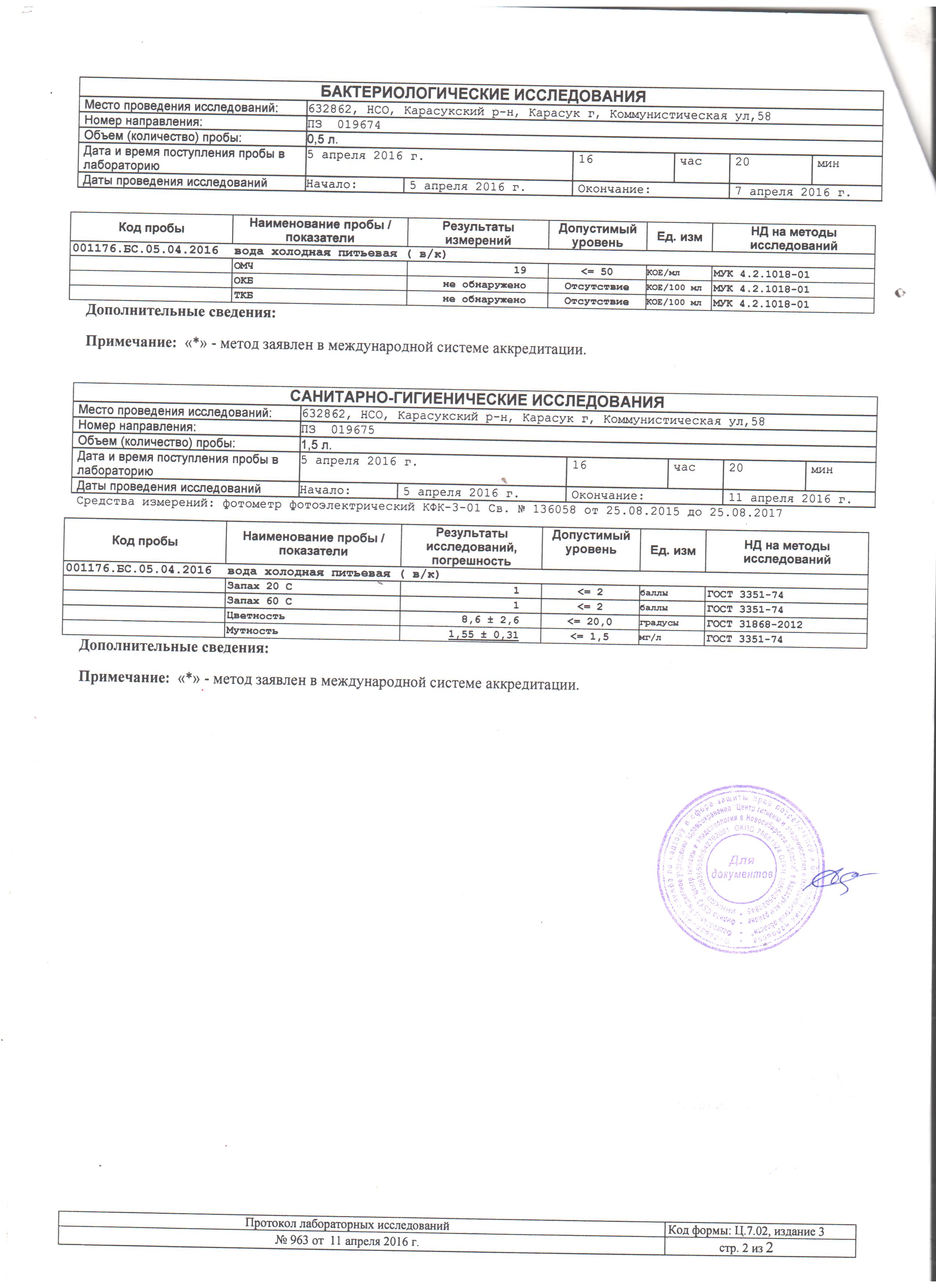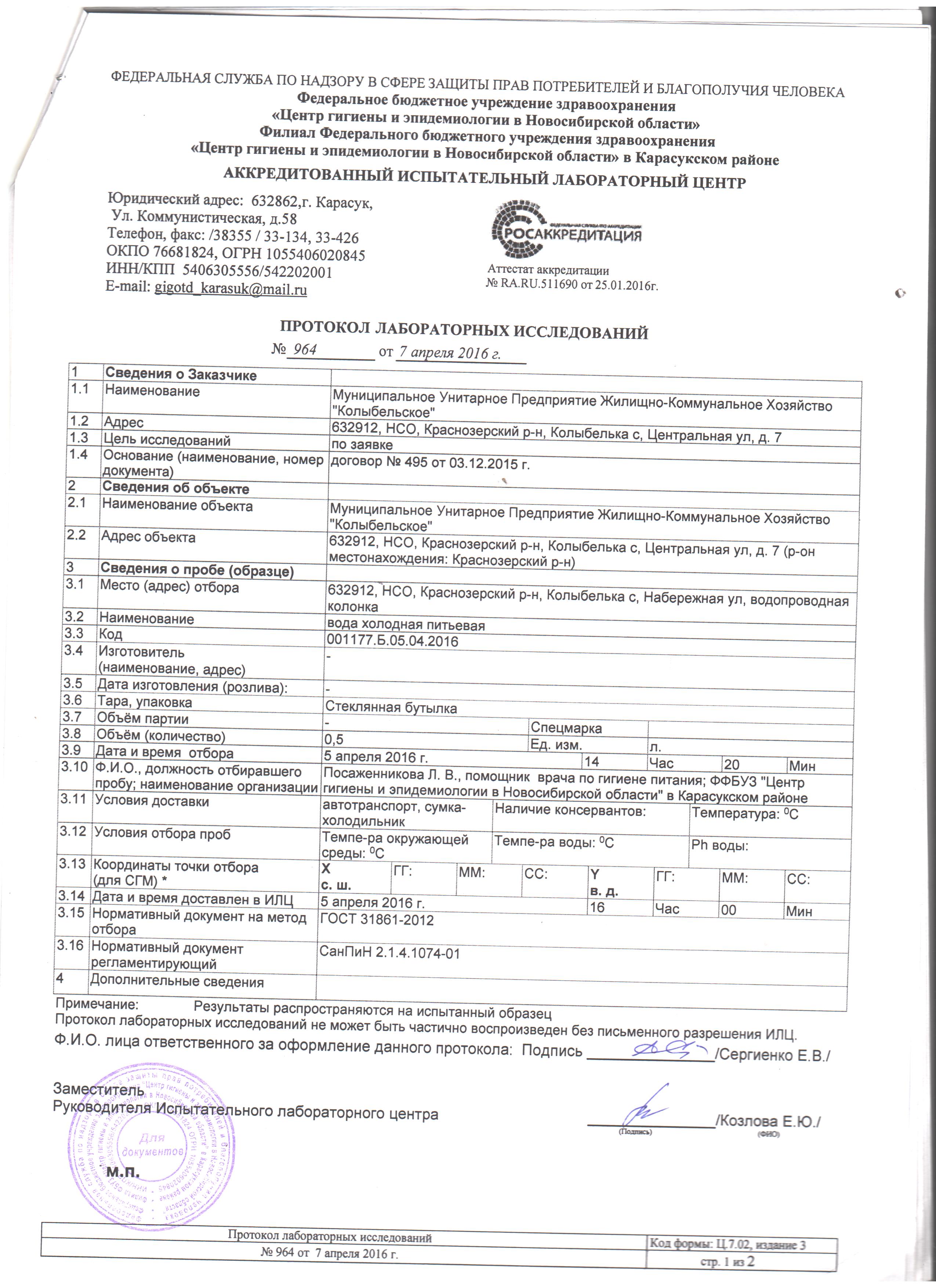 Управление Роспотребнадзора по Новосибирской области направила нам информацию о результатах проверок проведенных в ноябре 2018года в отношении организации осуществляющих водоснабжение на территории Колыбельского МО